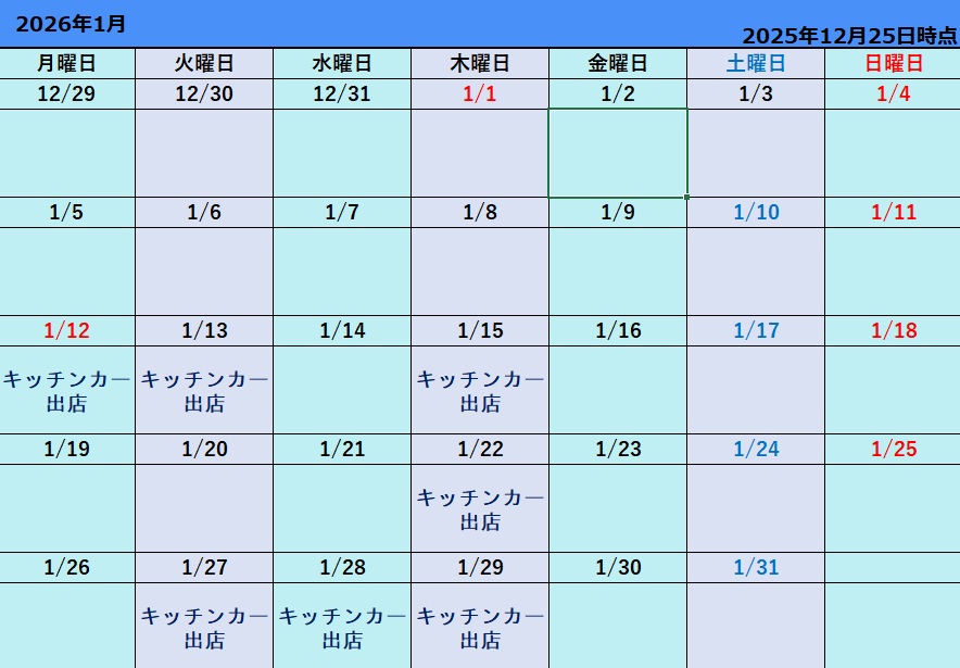 キッチンカーの詳細情報や最新情報につきましては、下記の「2026年1月キッチンカー出店カレンダー(最新情報)」よりご覧ください。