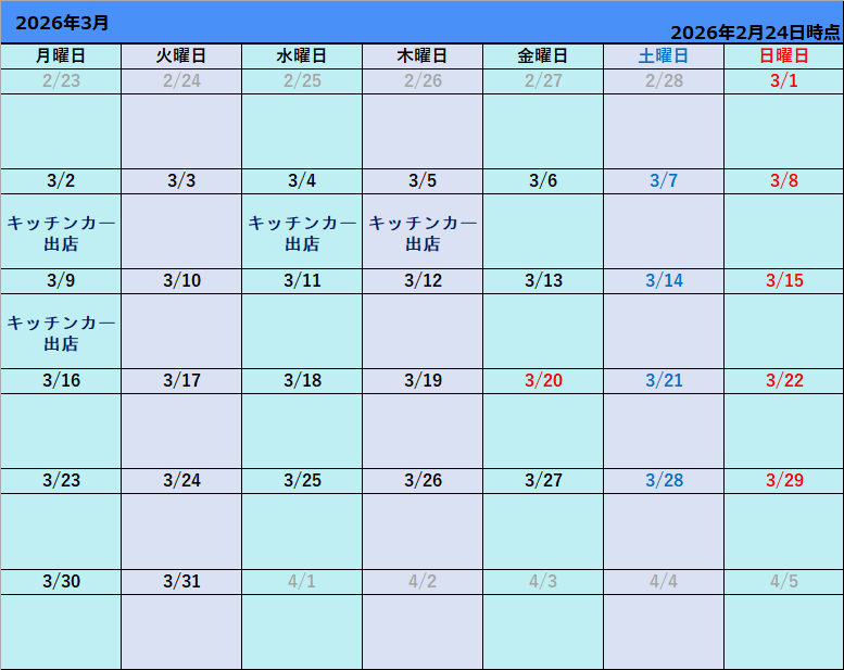キッチンカーの詳細情報や最新情報につきましては、下記の「2026年3月キッチンカー出店カレンダー(最新情報)」よりご覧ください。