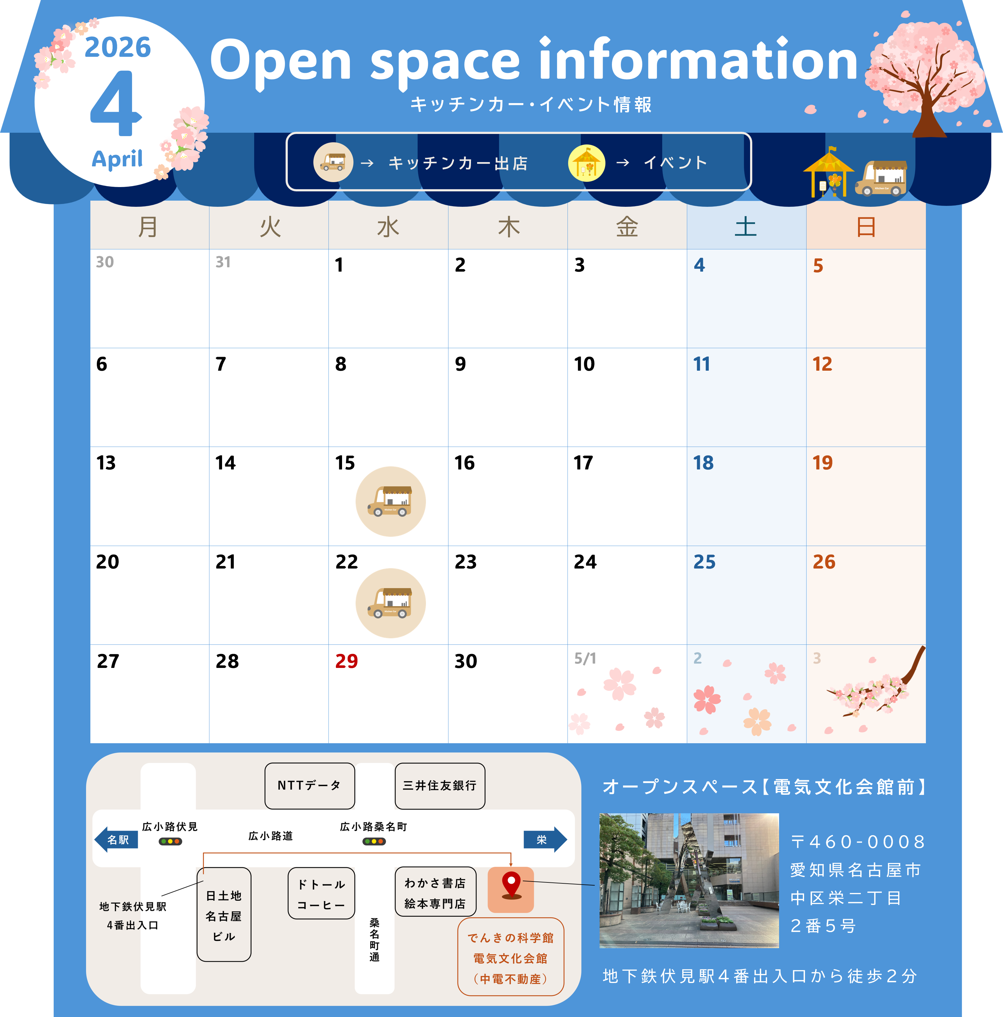 2026年4月の電気文化会館オープンスペースには、下記の日程でキッチンカーが出店する予定です。